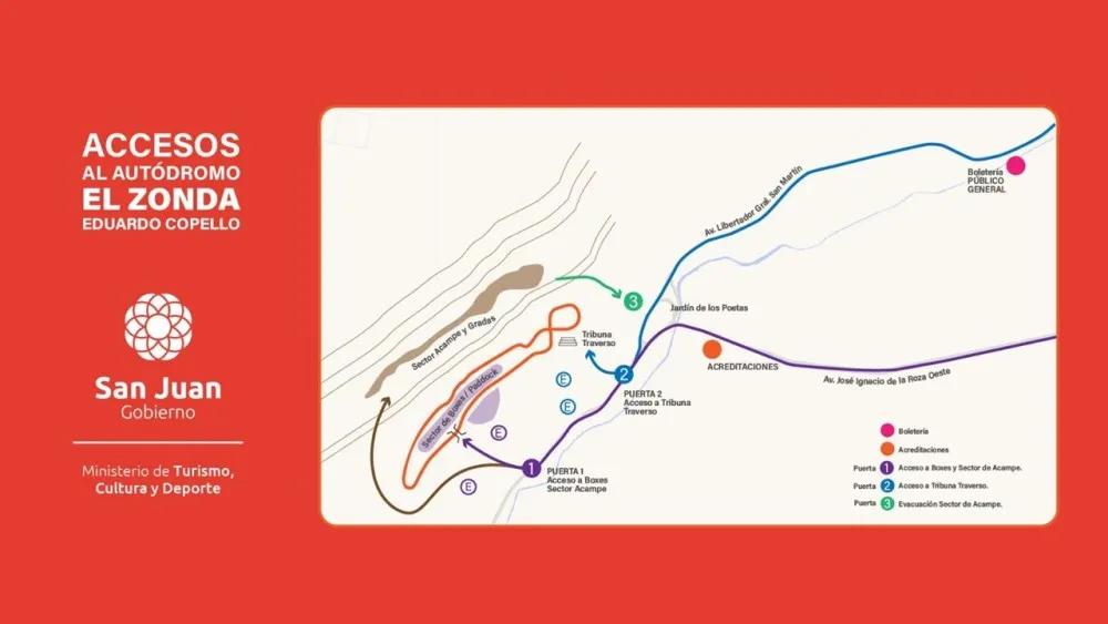 Las entradas continúan a la venta de manera presencial en el punto ubicado en General Acha 230 Sur, local 33, de lunes a sábado de 8 a 23, y también en las boleterías del Estadio Aldo Cantoni, de 15 a 20. Durante los días del evento, se habilitarán boleterías móviles en las inmediaciones del circuito, sobre Avenida Libertador antes del Jardín de los Poetas, desde las 7:00.