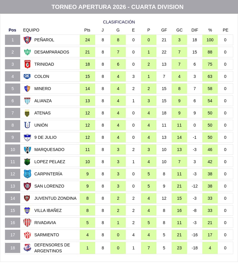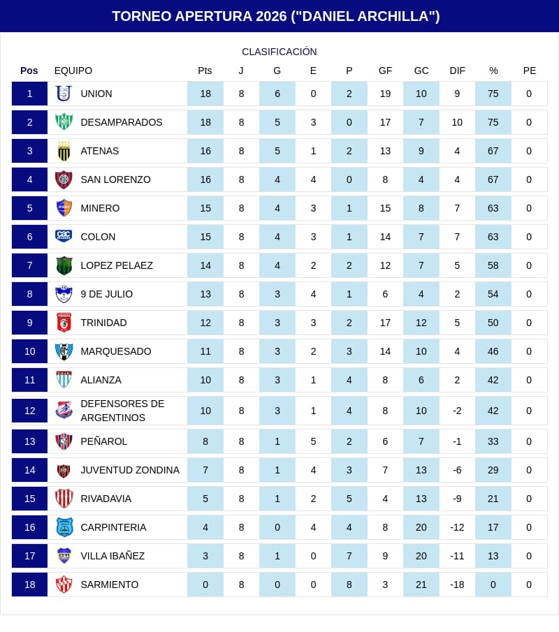 Con ocho fechas disputadas, Unión y Desamparados lideran con 18 puntos, en una pelea directa por el primer lugar. Detrás se ubican Atenas y San Lorenzo con 16 unidades, mientras que Minero y Colón siguen expectantes.